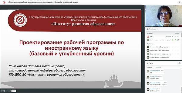 Состоялся вебинар «Проектирование рабочей программы по иностранному языку (базовый и углубленный уровни)». Среди участников 74 педагога из Ярославля, Рыбинска, Большесельского, Борисоглебского, Брейтовского, Гаврилов-Ямского, Любимского, Мышкинского, Некоузского, Некрасовского, Переславского, Рыбинского, Тутаевского, Угличского, Ярославского муниципальных районов и 17 представителей других регионов: учителя иностранных языков из Республики Коми, Удмуртской Республики, Алтайского края, Кировской области, студенты УрГПУ (г. Екатеринбург).