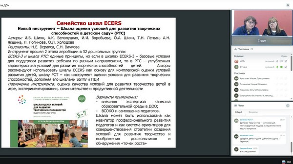 Сотрудники кафедры дошкольного образования Т.Н. Захарова и Т.Н. Зятинина познакомили участников вебинара с одной из шкал семейства ECERS, позволяющей оценить качество условий для развития творческих способностей детей дошкольного возраста в детском саду.