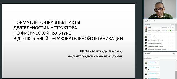 Модератор вебинара канд. пед. наук, доцент кафедры общего образования А.П. Щербак сделал обзор «НОРМАТИВНО-ПРАВОВЫЕ АКТЫ ДЕЯТЕЛЬНОСТИ ИНСТРУКТОРА ПО ФИЗИЧЕСКОЙ КУЛЬТУРЕ В ДОШКОЛЬНОЙ ОБРАЗОВАТЕЛЬНОЙ ОРГАНИЗАЦИИ».
