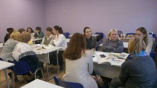 Старший преподаватель кафедры общего образования Наталья Владимировна Урывчикова предложила участникам семинара обсудить значение мультисенсорного подхода для изучения иностранного языка и подумать о конкретных приемах, позволяющих на уроке использовать сразу несколько каналов восприятия информации при работе над формированием языковых навыков.