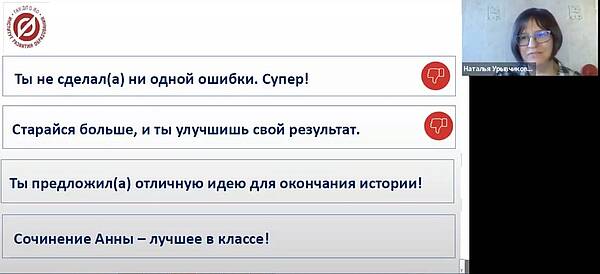 Учителя иностранных языков и вузовские преподаватели из разных регионов Российской Федерации обсудили функции, виды и структуру обратной связи ученику от учителя, проанализировали примеры мотивирующей и демотивирующей обратной связи.