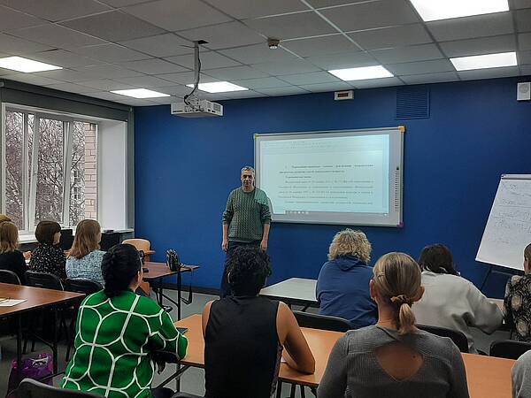На первом аудиторном занятии курса слушатели были проинформированы о возможности использования чат-бота «Помощник Рособрнадзора» по вопросам снижения бюрократической нагрузки на педагогов, получили куар-коды доступа к чат-боту.