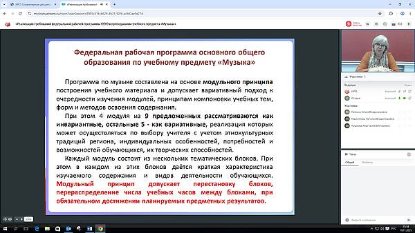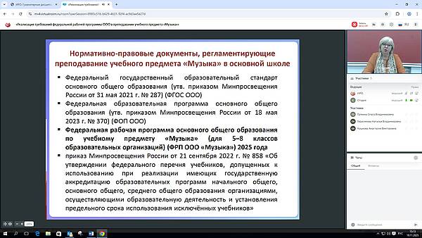 19 ноября 2025 года состоялся вебинар «Реализация требований федеральной рабочей программы ООО в преподавании учебного предмета «Музыка»». Кандидат педагогических наук, доцент кафедры общего образования Томчук Светлана Алексеевна рассмотрела вопросы следующего содержания: